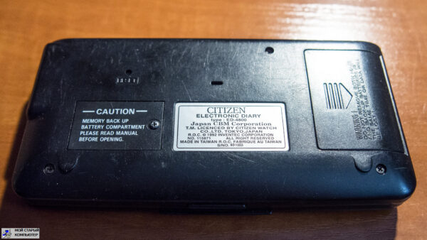 Сама записная книжка выполнена целиком из пластика, а когда была новой очень вкусно пахла (любители гаджетов думаю поймут меня). Сверху нанесен логотип Citizen, слева на нижней половине имеется разъем для синхронизации, спереди замок для фиксации половинок в закрытом виде. Слева и сзади ничего примечательного нет. Разве что, стоит упомянуть петли на задней части и злополучный шлейф. Здесь он в отличии от ноутбуков не скрыт, а вполне себе виден. И к счастью в исправном состоянии. Внизу имеется два слота для батарей. Две служат для питания самой книжки (тип CR-2025), а одна для питания памяти (тип CR-2016). Да, память здесь была энергозависима и батарейки надо было менять в особом порядке. Сначала основные, а затем резервную. Иначе вся информация в памяти записной книжки будет утеряна. Одного комплекта батарей помнится хватало где-то на полгода. Так же на задней крышке видно отверстие для перезагрузки (хард-ресета со сбросом всей информации) и отверстие для пьезодинамика. Конечно, никакой музыки на нем не послушаешь. Его максимум – писк различной интонации для сопровождения действий пользователя и различных напоминаний, а также будильника. Кстати, здесь стоит подметить еще одну деталь. Citizen ED-4800 сделан контрактным производителем – компанией Inventec Corporation с Тайваня. Эта компания существует с 1975 года и жива и по сей день. Она выпускает различную компьютерную технику по заказу Dell, HP, Lenovo, Acer, Toshiba, Amazon и других. Например, вот новость об Inventec датированная 2015 годом, да и на Википедии есть страничка о компании. В общем, очевидно, что перед нами девайс чье происхождение претендует на благородное.