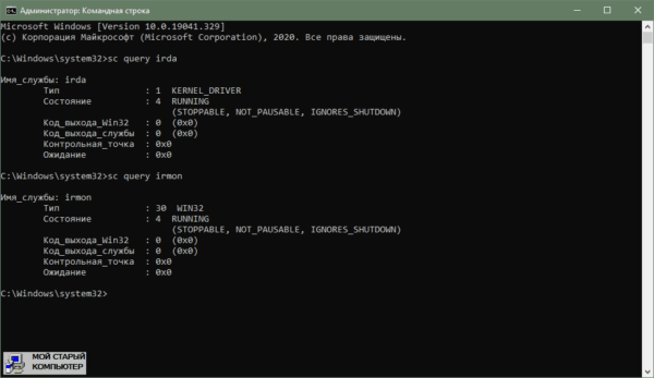 Затем запускаем командную строку от администратора и вводим две команды (sc query irda и sc query irmon), смотрим на ответ системы.