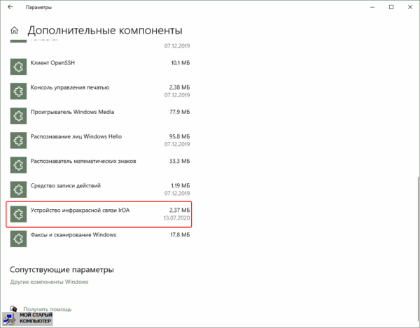 Для начала надо пройти в настройки системы и в разделе «Приложения и возможности» в подразделе «Дополнительные компоненты» установить «Устройство инфракрасной связи IrDA». Без этого все дальнейшие действия не имеют под собой никакого смысла. На скриншоте ниже он уже установлен.