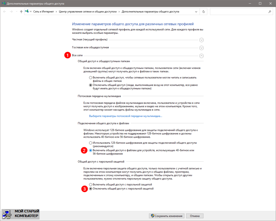 Затем надо будет в настройках общего доступа понизить уровень шифрования и доступ к общим ресурсам по пароолю. Возможно делать это необязательно, но в некоторых случаях без изменения этой настройки ничего работать не будет. Делается это в параметрах системе в разделе «Сеть и Интернет» по ссылке «Изменение расширенных параметров общего доступа».