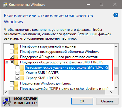 Для начала надо активировать поддержку устаревшего SMB v1. Это делается через апплет «Компоненты Windows» в настройках системы. Он находится в разделе «Приложения и возможности» в подразделе «Дополнительные компоненты» по ссылке «Другие компоненты Windows». Нас интересует активация пунктов отмеченных на скриншоте. После их установки потребуется перезагрузка системы.