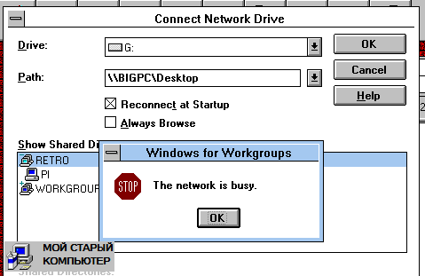 С этими системами у меня пока у меня не вышло заставить работать общие папки. Между ретро-ПК, вне зависимости от версии ОС, все работает отлично, а вот с компьютером на Windows 10 связь установить не выходит.