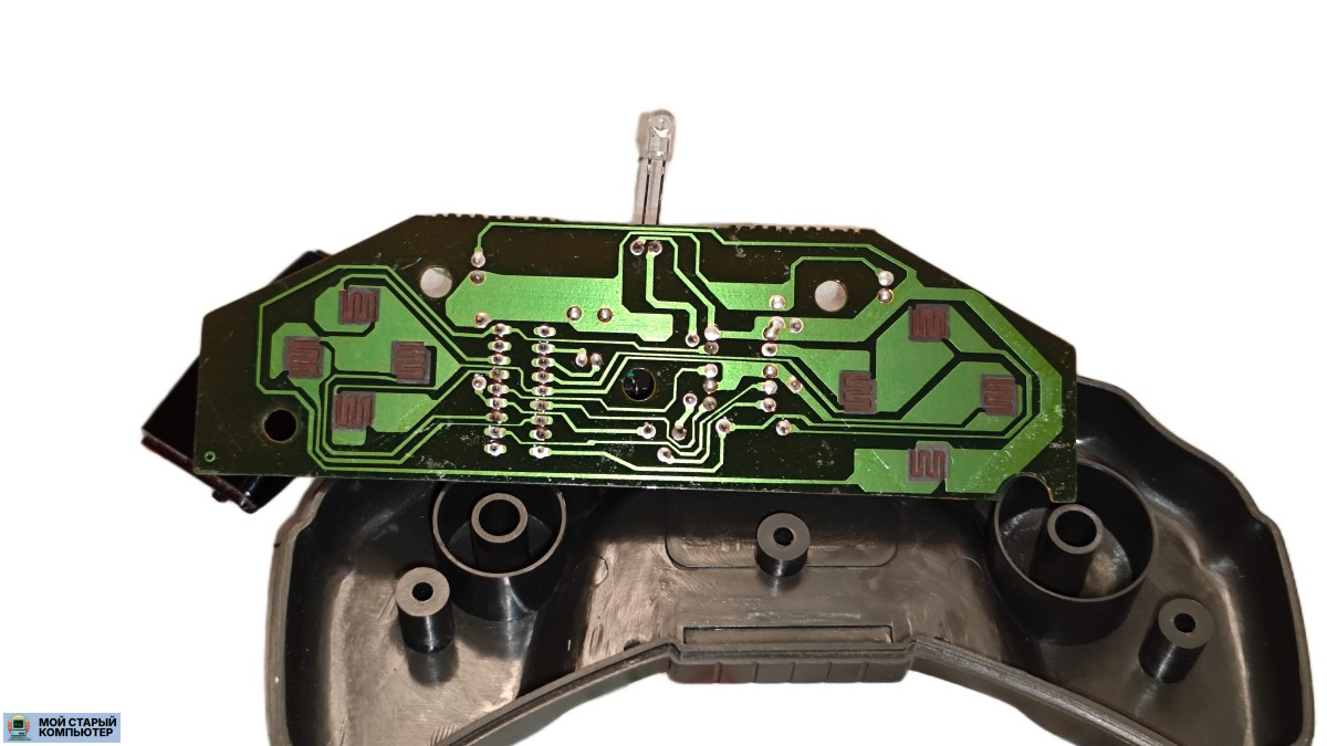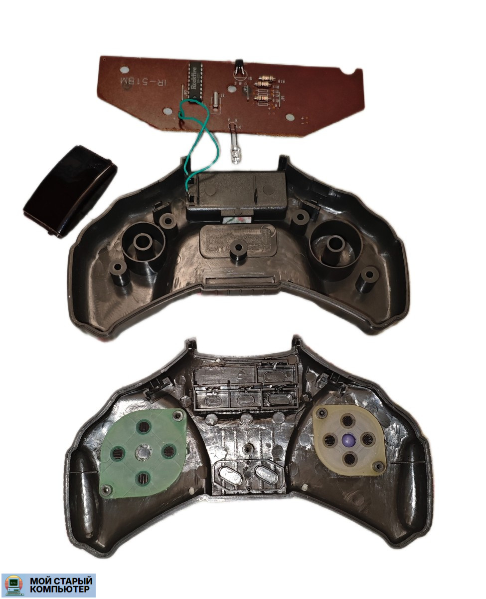 После просушки и сборки был повторный тест и я уже капитально на этом паде поиграл. И в целом это очень приятный геймпад. Мягкий и удобный. И хоть на фото у пада 4 кнопки, но по факту их две. Две обычные плюс две турбо-версии обычных. Такая конфигурация, правда, маловато будет, но для тех же игр под DOS вполне пойдет. Несмотря на то, что беспроводность здесь реализована через инфракрасный порт (!!), это не является большой проблемой. Видимо приемник и передатчик тут стоят достаточно «глазастые», что бы пад хорошо работал даже вне совсем прямой видимости между ними.